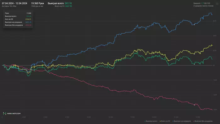 На джекпоты перееапало, по игре жопа, ладно хоть 0. Кучу раз уже ныл тут о том, что гоночный раш понемногу загибается и продолжу, золотые времена не вернуть, надо было выносить отсюда все деньги 1-2 года назад, 2 года назад конкуренция среди 24/7 гриндеров была 1-3 человека, сейчас 4-6. Винрейт у меня сейчас ниже, хотя играю явно лучше, чем раньше, когда в последний раз за столом 1500 бб набивал уже и не вспомню.