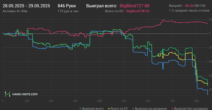 Но как же покер обманчив. Немного апстрикнет в нужный момент и из тебя так и прёт эго, что в жизни, что за столами, нет тормозов, пусть даже праймовая Джоли сейчас передо мной будет я ей скажу такой "Красотка номерочек сюда давай". Но я уже заметил, с периодичностью бывают сессии в строчку -10-15 БИ и это дефолтище максимальное в моей дисциплине, вс регов и не самых слабых. Да даже вс фишей как показала практика такое возможно. Пора бы уже научиться принимать это адекватно, а не идти сливать 75% своего ролла в лудке.(