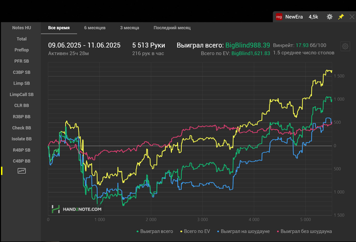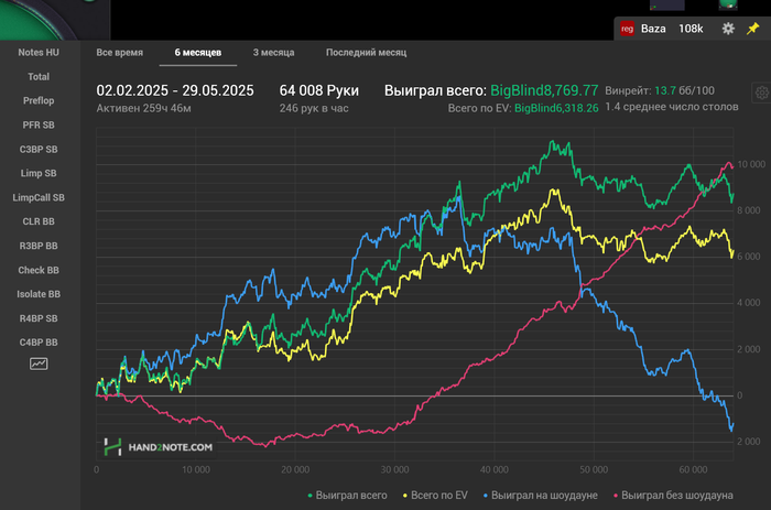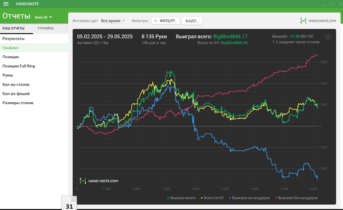 Сейчас ролл на пике. Научился добавлять новые клубы, искать игру везде, где есть возможность. Лучше зацепиться за мертвого полуфиша с 40бб среди 30столов, чем месить говно с топрегами. Реалии покера 2025.