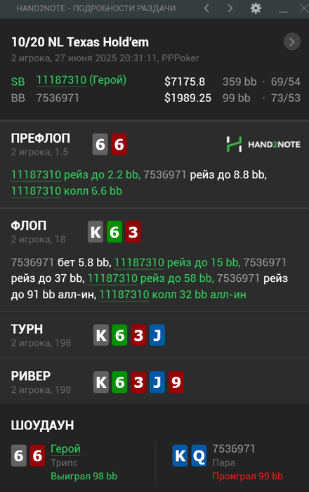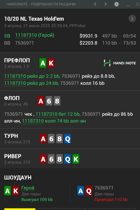 В такой раздаче отгрузил ему стек. Внутри все кипит, лечу уже че-то -6к с утра. Попросил депнуть 6к фишек сюда.