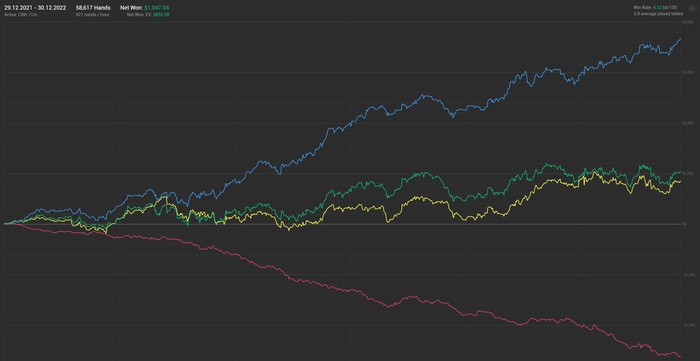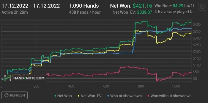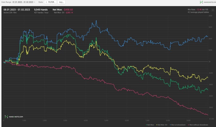 уходит 100-120бб каждый час, поделить на всех то вот собственно и весь твой винрейт. Бьется только если в супер дипах все и есть випач хотя бы один который прям заливает сильно, но такого не было.