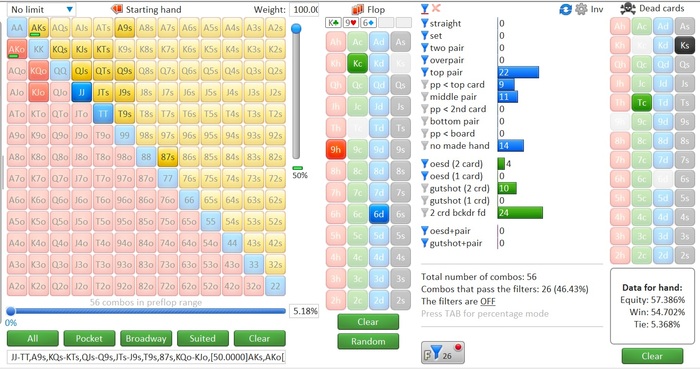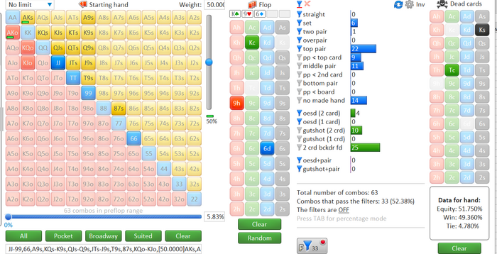 Опп пассивный фиш легко заходящий с любым одномастным бродвеем и коннекторами. Половину АК закинул в кол только. Такие игроки часто их не трибетят. Валеты хз, мб часть и ушла бы 3б, но не так важно. Прикинул примерно такой диап кола префлопа и кола сбета. Т.к. мы для себя решили что он не байтит, а ошибся, то сэты и доперы исключаем. Получаем норм перевес по эквити. НО, даже если решил что натсы там остались, то перевес все равно у нас.