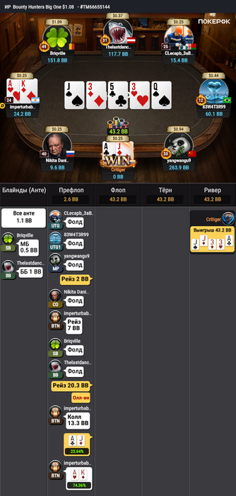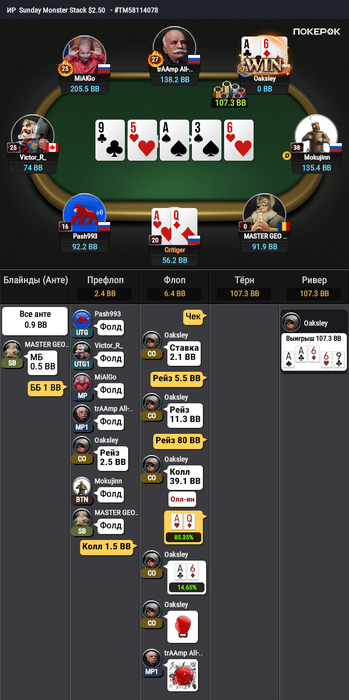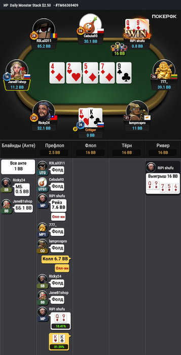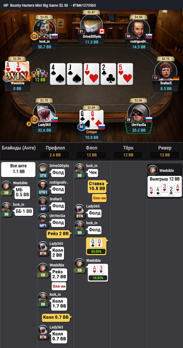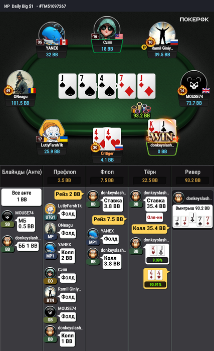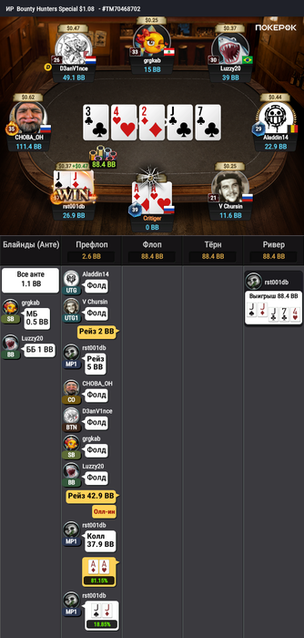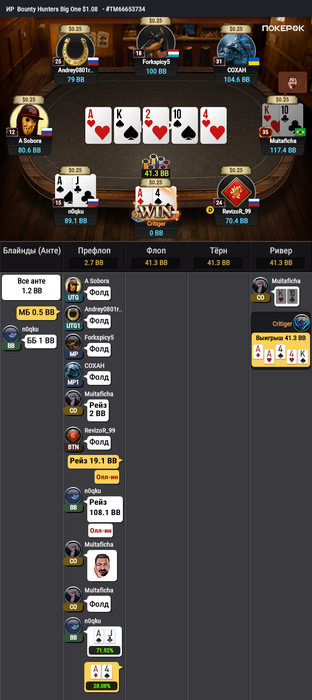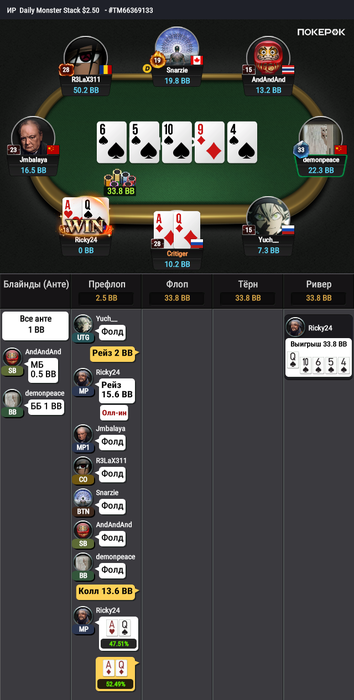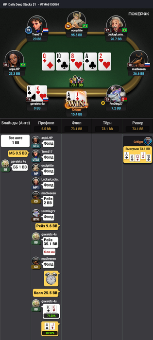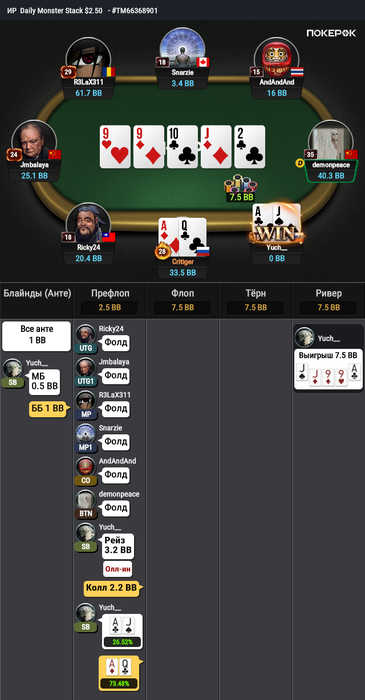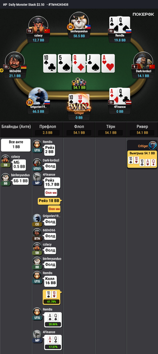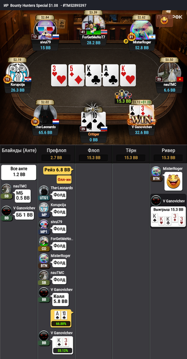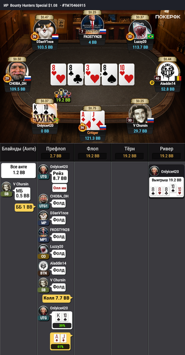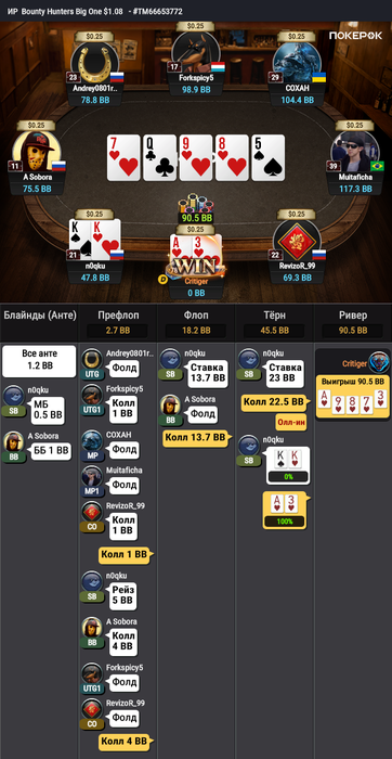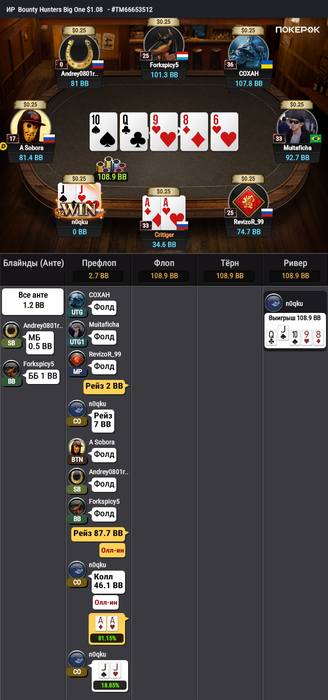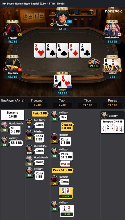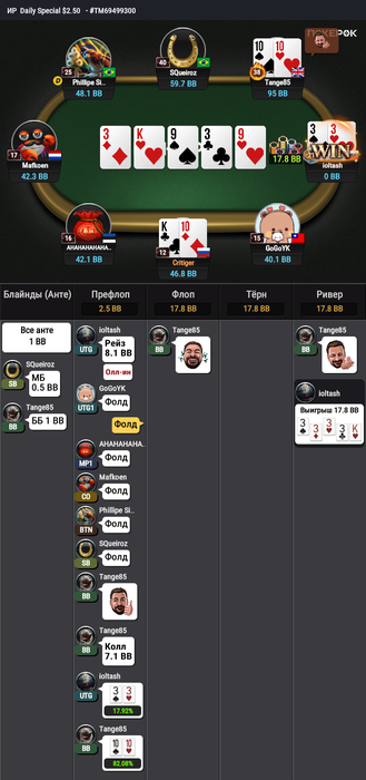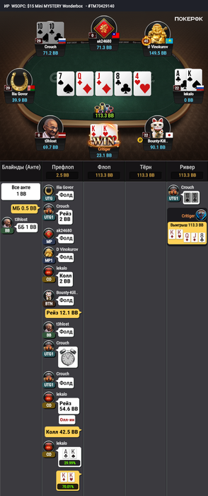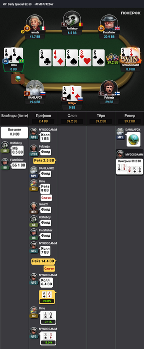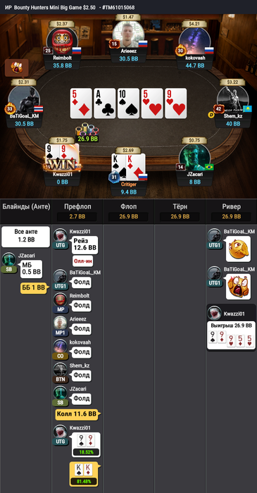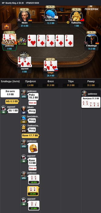 -Ну да, все правильно, парню плиз за смелость, отвагу и отчаянность, с хорошими картами все могут, а надо выигрывать с плохими, так же интересней...