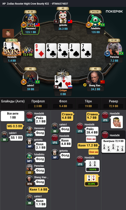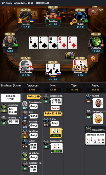 По вчерашней сессии, начал бодро, почти сразу в бусте отдались два чела, а потом как переключили рубильник. В бусте и в другом ноке по итогу попал в призы, в ноке упоролся с тузами в трипс, в двух туриках даже в призы не попал. Тем не менее в нокаут борде еще в топ 10 держусь. Сегодня снова работаем дальше.