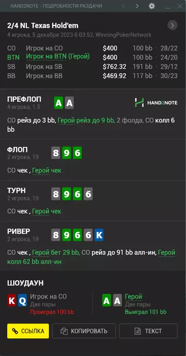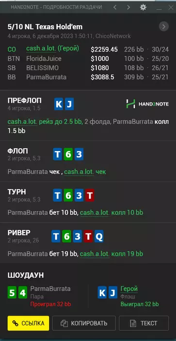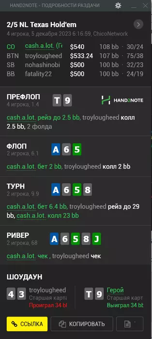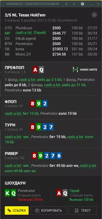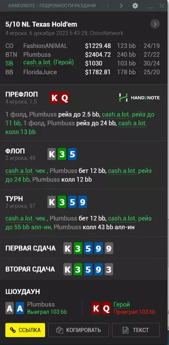 Две оч вопросительные раздачи с моей стороны. В первой пришел к выводу, что лучше для кола руки просто нет, кроме натсов.Насчитал себе в голове комб 5 велью+-, чтобы я колил в плюс, нужно совсем немного блефов тут, опп суперкомпетентный и думаю у него будут тут блефы. Жаль касарь с небольшим не туда уехал конечно))