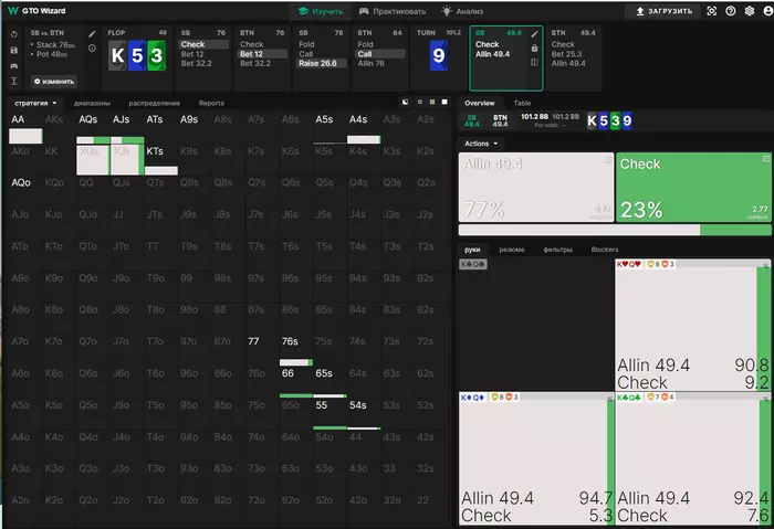 Флоп абсолютный деф, рейзим КД грубо говоря почти всем весом, как блефы юзаем пополам бд АД и чутка АЖ и низкие ГШ и пара+бд, терн очень интересно!