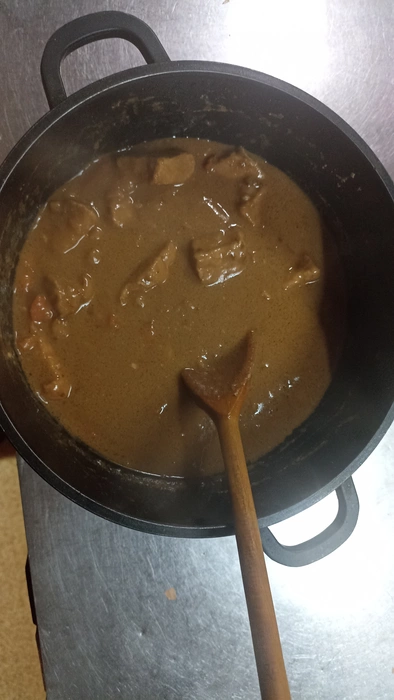 Очень интересно наблюдать за реакцией человека который пробует, не зная что это. Арахис в соусе выглядит как фасоль. В начале у нее шок( ожидание мягких бобовых), понимание что это, а потом с удовольствием хрустя орешками с мясом. А я кайфую.