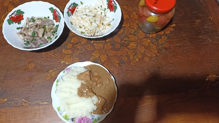 Капуста своя, с зеленым лучком, дом. маслом и немного сахара. Маслята собраны в лесу, которого уже нет.