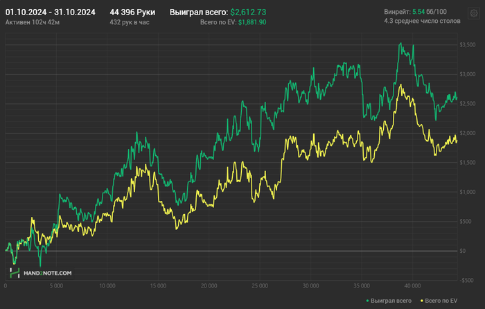 По кассам +3500 (х2н теряет некоторые руки по логике должно быть чуть больше плюса на графике), из них 719 рб на текущий момент. Парочка сотен должна еще упасть в следующем. Про часы уже расписал. Рук/час получилось меньше чем в предыдущих месяцах. По моим ощущениям были дни, когда игры было непривычно мало. Например, воскресенье 20е число было мало игры совсем, скучал на 2-4 столах. А вот прошлое воскресенье уже было получше. Тут не угадать. Ну и сломанный моник не способствовал большому количеству рук/час.