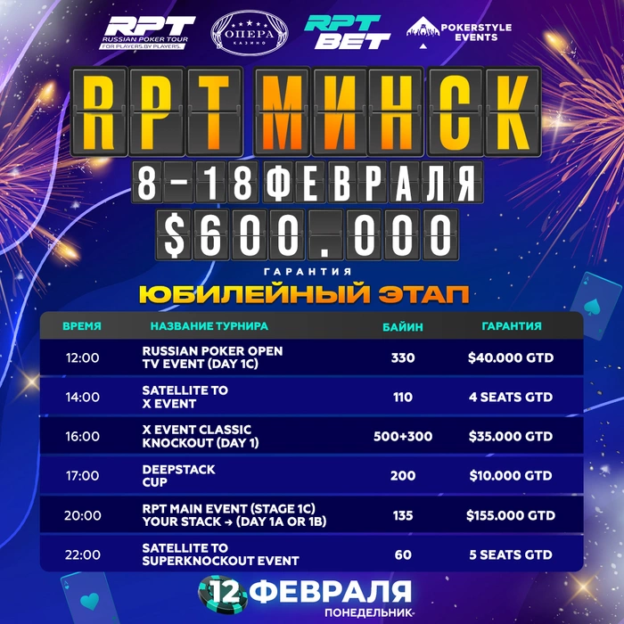 Ещё один день юбилейной серии Russian Poker Tour... и очередная порция турниров! 🤩 Сегодня нас ждет: ещё один флайт к TV-event, два сателлита, стейдж к мейну, один сайд ивент и один из самых дорогих турниров серии с бай-ином $800.