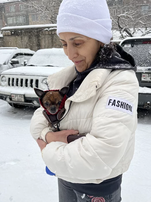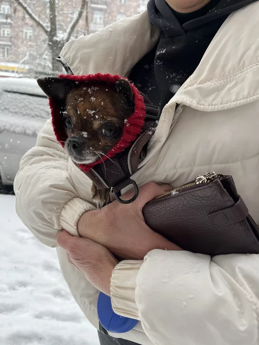 Сафушку мама всегда берёт с собой под куртку, потому что не хотим дома одну оставлять, но и ходить, гулять она не может, зимой лапкам холодно)