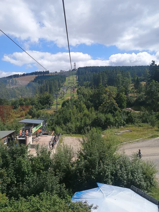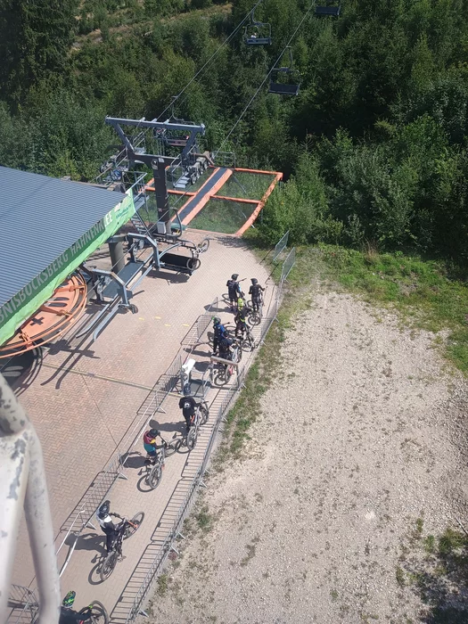 Подымались на гору на канатной дороге в кабинке, а паралельно был кресельный подъемник, который перевозил маунтенбайкеров с велосипедами вместо лыжников - они спускались с горы потом! Очередь на посадку не заканчивалась.