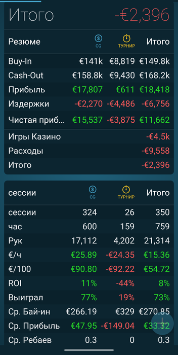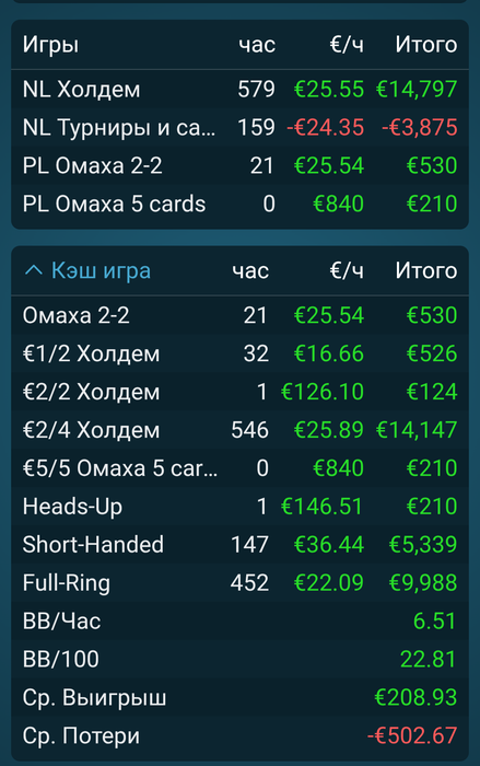 Учитывая, что я почти не знал как играть в оффлайн кеш, то результатом доволен и это учитывая дорогую "евровую" составляющую игры. Я научился играть против регуляров, умею играть коротким стеком (уверен, что играя глубоким стеком, можно как минимум в 2 раза лучше иметь результаты). За это время я больше узнал своих негативных сторон, которые мешали мне играть и пути их устранения. Что загнало меня в минус - растрата выигранных денег, т.е. когда я выигрывал то тратил как "свои", но когда проигрывал, то банкрол пополнять было не с чего. Кроме этого позволял себе проигрывать деньги в казино в Ультимейт покер. Много денег тратилось по типу как зарплата, но покер - это не зарплата и отношение должно быть другое к деньгам (пока ещё не знаю как назвать это). Доверял людям, которым не стоило было доверять, особенно в среде казино. Переборол в себе страх. Возможно произойдет какое-то чудо, но я в это не верю и всегда надеюсь только на себя и свои силы. Мы одни приходим в этот мир - одни и уходим. От отчаяния проиграл оставшиеся деньги и залез в долги. Не знаю сколько времени пройдет чтобы восстановиться. Утрата банкрола что-то похоже на физическую смерть наверное. Было очень интересно прожить это время, покер давал мне возможность чувствовать себя настоящим! Может и правда деньги любят тишину? Надеюсь разлука будет не долгой и я снова буду в строю. Bis bald!👋