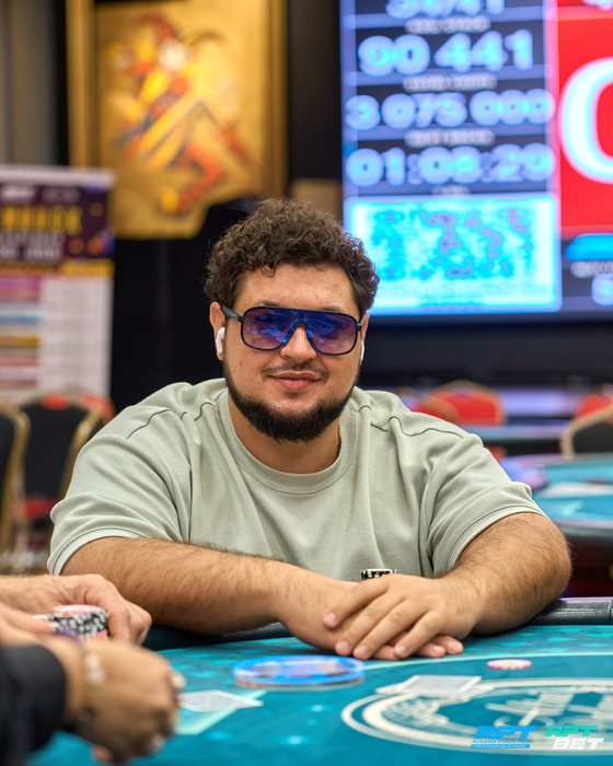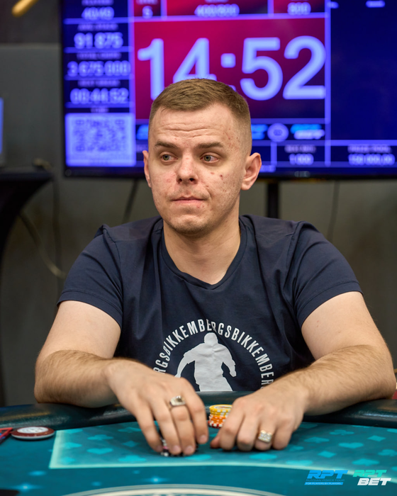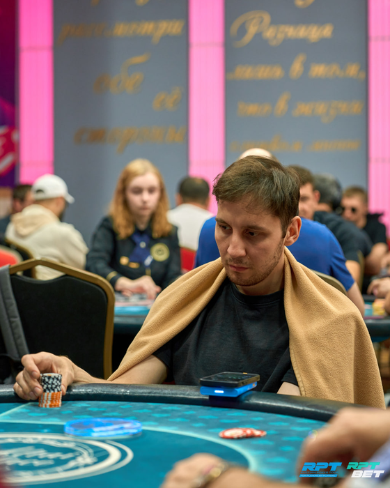 За 5-ым столом в это время Мансур Ибрагимов с поймал удвоение своих 155К в выставлении против Дениса Горбачева. Флоп был с десяткой, у Дениса осталось 15К.