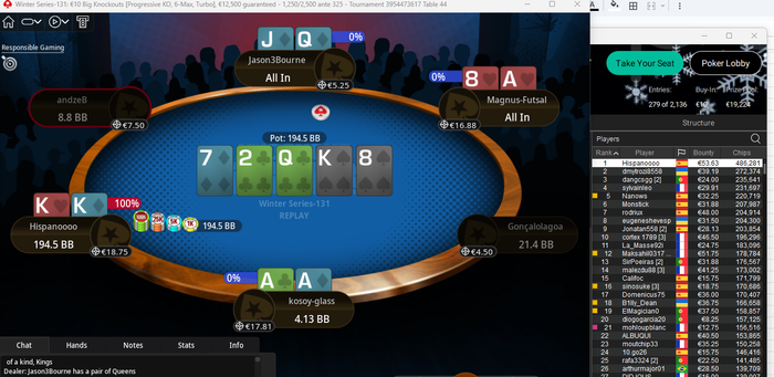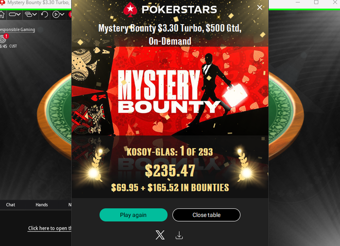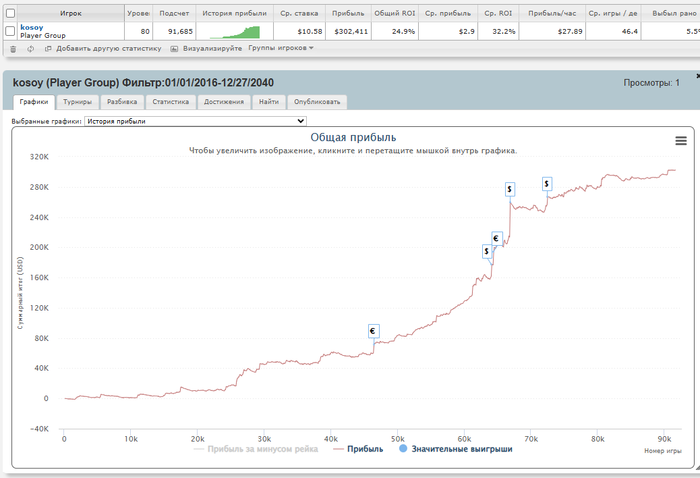 А общий если посмотреть то мне всего 1 раз выпадал нокаут в 300евро почти на 500 турниров. Я ежедневно играю все мажорные до 20евро,где топ нокауты доходят до 1-2к и множество других наград,но увы нет ни финалок ни нокаутов ,но зацепы были.