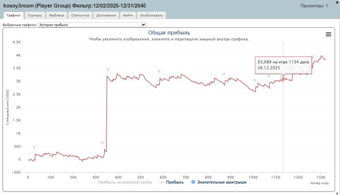 В общем нажил чуть меньше чем обычно. Возможно повлияло то, что я в megamystery(это когда стадия случайных наград начинается после окончания регистрации) начал заходить тоже в лейт регу и зацепов не было .Общий приоритет ставил на лейт регу по румам ,а не основную сетку "любимых турниров" , но если бы не ставил, то и не выиграл бы 3к в турнире за 5.5$ ибо я его вообще не играл. По этому в новом году приоритет буду ставить на основные турниры, а вспомогательные лейт рега.