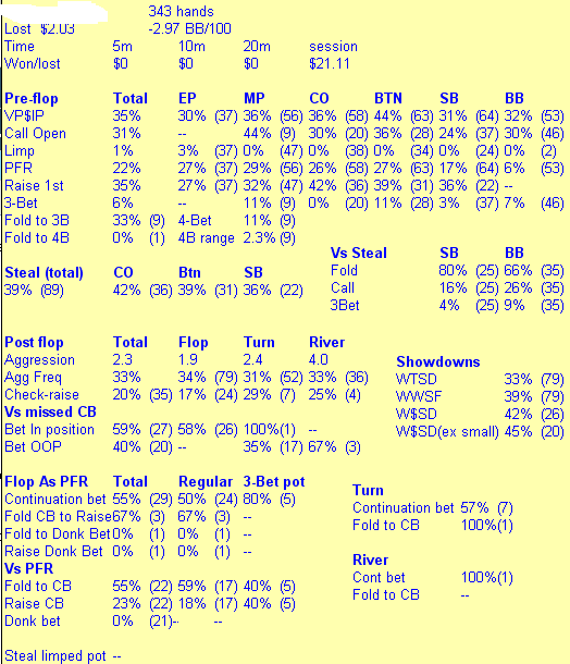SB wins $36.29 на чела мало рук, всего 175. Играл он 23/16/2. Агрессия по терну 1.0, но рук то мало, значит почти ни о чем не говорит....