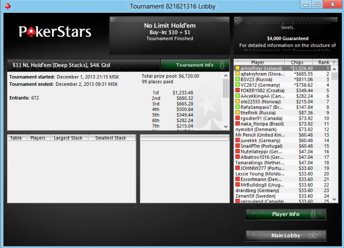 Poker Stars $10+$1 No Limit Hold'em Tournament - t22500/t45000 Blinds + t5625 - 8 players -