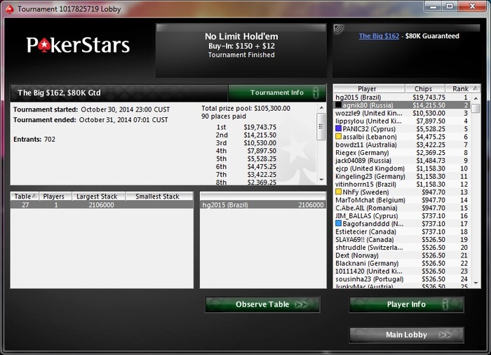 Как то начало года не задалось. Первые две сессии сыграл просто без итм, а в воскресенье и во вторник это очень больно. Дальше стало чуть лучше, однако динамика изменилась не сильно. Снова засел за учебники, разобрали с Артемом (gorglav) некоторые турниры, я произвел некоторые корректировки. Вроде дело пошло. Вчера был хороший дип в биге109, где я был чиплидером со стеком 75бб на 18тел и снялся 13-м. Tollgate оказался непобедим в олынах и выиграл у меня две огромные монетки на 25 и 30 бобов. Сегодня PS поунижав меня в Thrille похоже решил отложить ремень и дать конфетку. Раздавали в поздней просто феерически, наверное я убил почти всю финалку самостоятельно, правда в ха снова вернули кнут. В итоге поделили с Блаффи когда он уже был чипаком мастерски переиграв мои КК своими А7.
