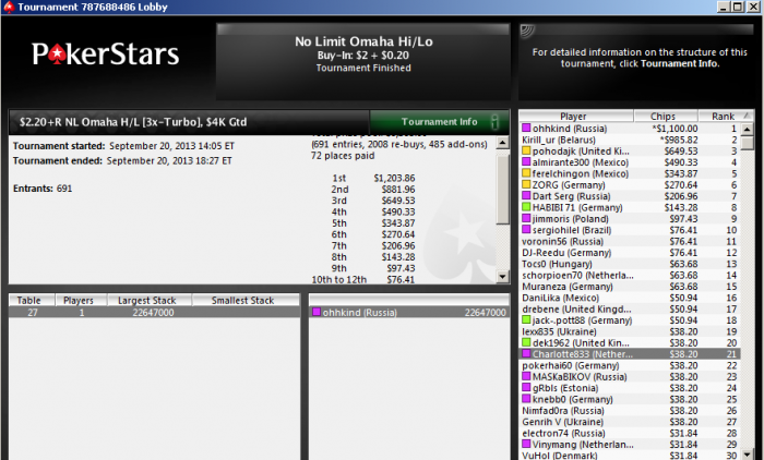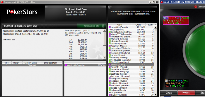 Наконец-то в череде надежд и разочарований, появился небольшой просвет, несмотря на то, что начиная с 3-х столов шёл между ТОП1 и ТОП3 , на финалке сразу не повезло с рассадкой, в позе на меня сели единственные 2 понимающие cedrick89 и PrivateShow1, оба поливали, как из пулемёта(для примера посмотрите статы победителя с финалки), очень сложно было с учётом, того что шортов много, и почти все всегда были справа, а эти 2 морона, как на зло, слева. В ХА вышел шортом, сразу выиграл монету 98s>33, но следующей рукой проиграл KJs <55, а так б начали ХА с начала равными стеками. П.с. без аурки младшенького Костика, занос был бы невозможен!!!