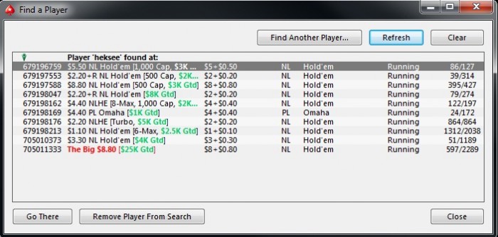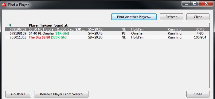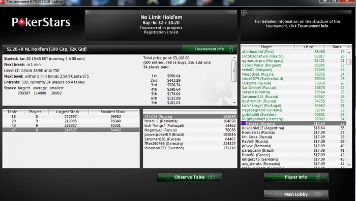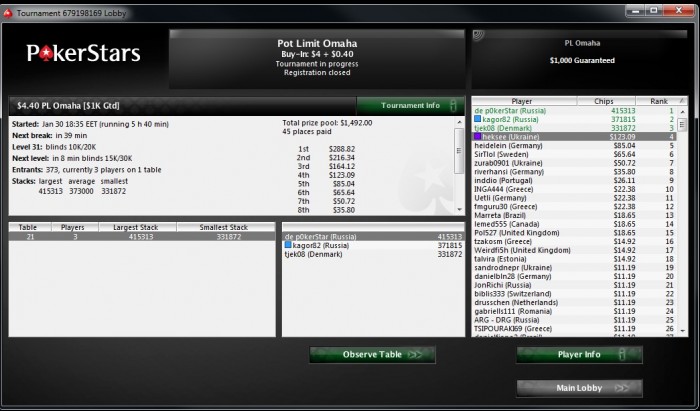Poker Stars, $5 Buy-in (800/1,600 blinds, 200 ante) No Limit Hold'em Tournament, 8 Players