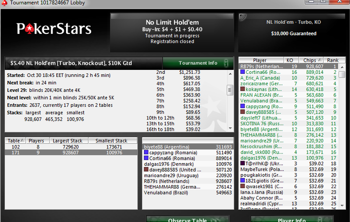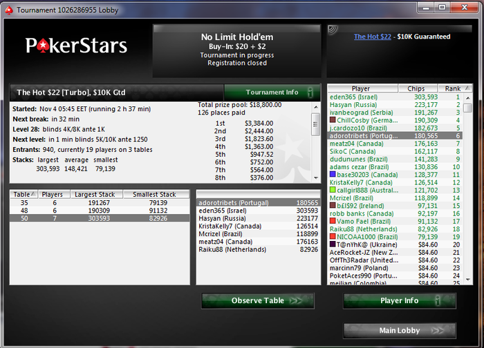 Poker Stars $2.00+$0.20 No Limit Hold'em Tournament - t500/t1000 Blinds + t125 - 9 players -