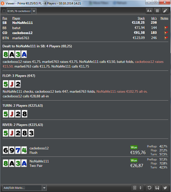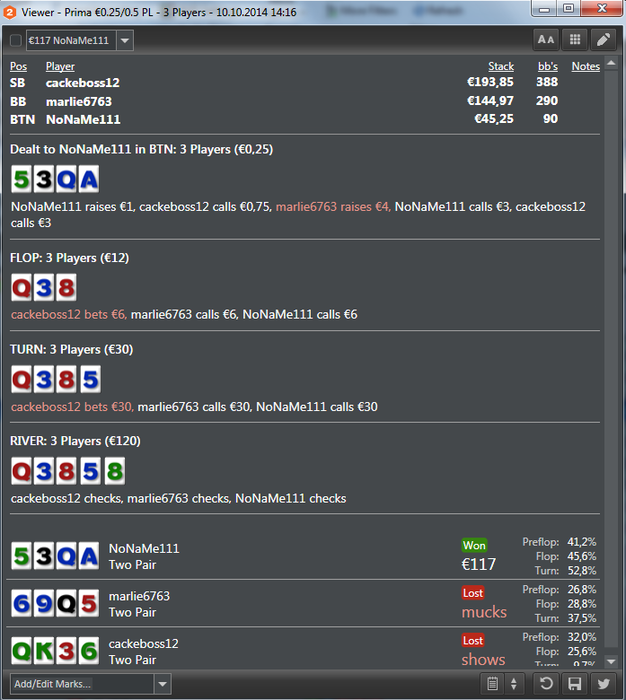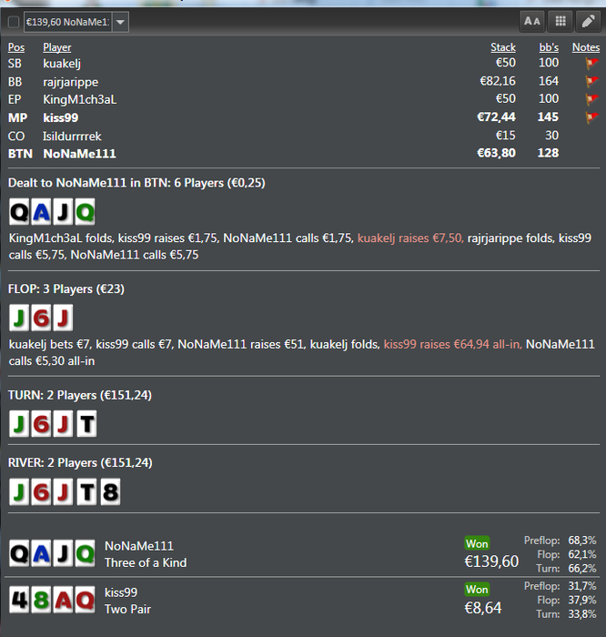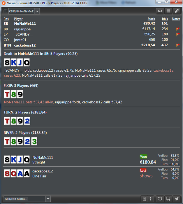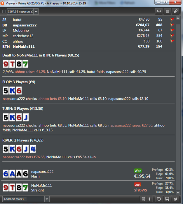 Noname111, якщо це той самий Гордон, то треба з самим Гордоном говорити, але я думаю, що це було десь так: а) Гордон подумав: єбать! мене Нонейм крутить без пози (думаю він тебе вже знає) і не лише як людину, а ще й мабуть і по статистиці. щас, думає, я йому жити не дам на флопі. а рука погодься в Гордона якрза саме та, щоб не дати тобі жити на багато яких флопах. і так, падає флоп. ти ставиш пот! і о богі, орієнтовні думки в Гордона: ахуєть! куда він ліпить в цей флоп таку ставку: він же не попав сюди зі своїми тузами. вєрняк вони в нього голі! а дай ка я засажу суда лєну, маю скрите стріт-дро, бекдор флешдро і купу друга пара-дро і два аута на тріпс-дро і ще й мабуть відсотків 20 на фолд-еквіті. б) йому банально захотілось проти тебе погемблити, в) він балансує свою блеф-гру і гру на велью. Взагалі НЛКат дуже агресивно, дуже диспово і +до всього дуже добре грає. тому я думаю, що тобі банально заканало ;) і це попри те, що це вроді як твоя гра, але я чув, що він робить успіхи(це я не про виграв, не виграв, а про роботу над грою, над якою, як мені відомо, даний гравець, працює багато) і в ПЛО теж.