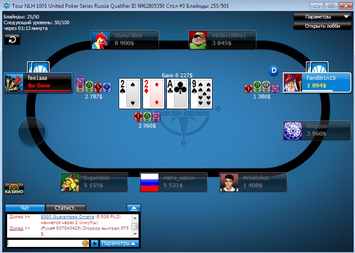 Кстати, за этим столом случился и первый аут, когда "misha_osinov" выбил "MrG00dkat" c против , собрав две пары с тузом...
