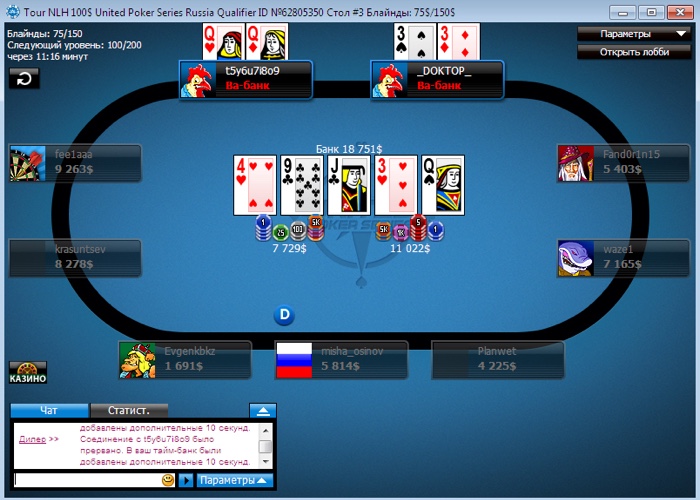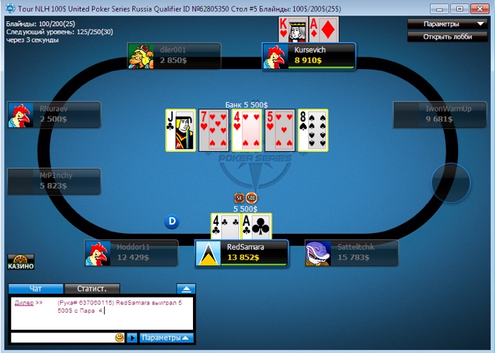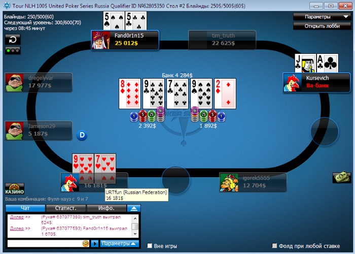 Первым, кто переступил отметку в 10К, стал "t5y6u7i8o9". Игра его, впрочем, особой оригинальностью не отличалась: он ввязывался в большинство банков, ловил свои неочевидные ауты, - и забирал фишки соперников. За его столом, признаться, был самый интересный экшн! Какие-то сплошные силы, попытки забрать фишки без вскрытия, олл-ины... Мерились силами кроме него еще "fee1aaa", "Fand0r1n15" и "Dropppp".