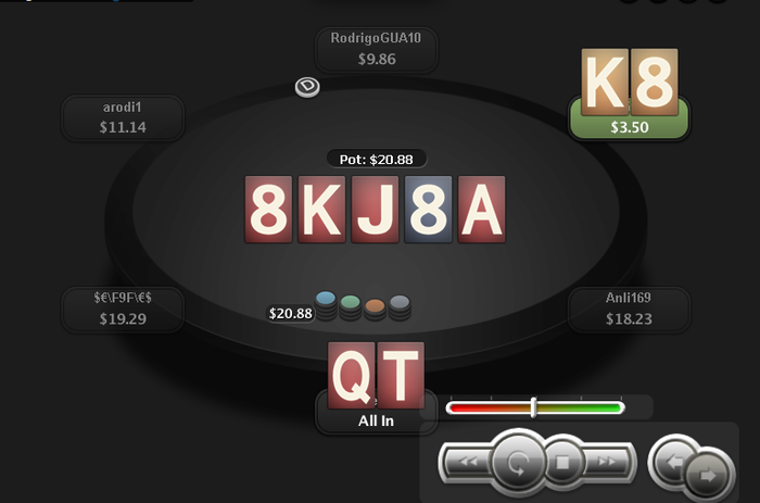 Думаю блеф в данной раздаче будет примерно в 50% раз. В моем диапазоне такая же куча дров (после моего чека на терне). Соответственно играть блефом на ривере ему есть смысл.