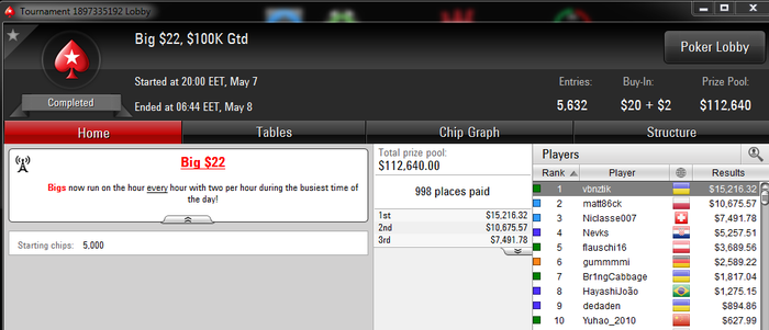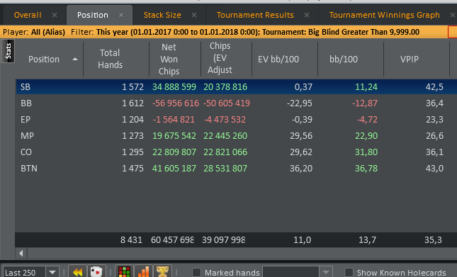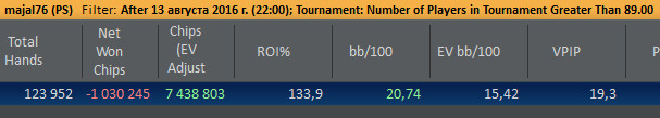 Всем Доброго дня и хорошего настроения. Коллеги по цеху любят показывать винрэйты. Я очень мало играл прошлый год, но в этом году последние 2 месяца плотно играю. Много работаю над своей игрой и с ребятами тоже много занимаемся. Выше на рисунке видно моё ЕВбб при Блайндах 9999+ Я очень давно выкладывал последний раз скрины своих результатов. Сегодня как раз очень подходящий случай :). В фазу прошёл с мелким стэком потом удалось распихаться и начал активно играть. Моим соперникам дважды удалось реализовать эквити КК < 88 и А9 < А6 :) 22й биг отыгран расковано и великолепно :). Мои оппоненты очень хотели, чтобы я его выиграл, и я принял свою Судьбу с Радостью. Благодарю Всех ребят, Которые тренируются под моим началом, это и Ваша заслуга.