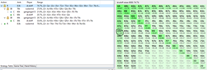 Статы оппонентов Vpip/PFR: СБ 19/14, ББ 25/16 Оппонент на СБ тайтовый и закрывать наш пуш и рестилить будет уже, чем по равновесию, поэтому в расчетах я скорректировал его диапазоны. На ББ оппонент достаточно лузовый, поэтому его диапазон колла нашего пуша будет близок к Нэшу, а диапазон рестил/пуша, думаю, всё же несколько уже.