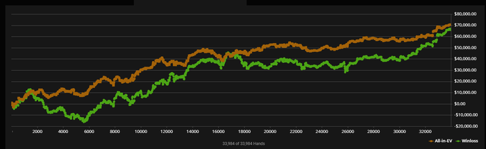 Вот так выглядит без учета рейка в покер - крафт. Вышло 23 ЕВ бб на 100 на 22к рук