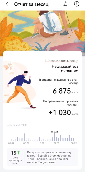 Ходьба. В Казахстане ходил неожиданно мало. Уже писал об этом в отчёте о поездке, сыну пришлось много работать, поэтому почти не гуляли. По сути был один раз. Ещё поход на хоккей, но даже тогда мне пришлось отправиться одному (полпути автобусом, полпути пешком), а сын приехал позже, на такси, к началу второго периода. По приезду традиционно заболел, поэтому никуда не ходил. 20 сентября задумался. Сейчас я хожу по 5000 шагов в день, точнее это установленная норма, которую я выполняю через раз. Конечно, это вынужденная мера после травмы колена. До этого ходил по 10000 шагов и обязательно. При этом вес у меня не сбрасывался, но хотя бы оставался прежним (как у красной королевы, которая бежала изо всех сил, чтобы оставаться на месте) . За два с лишним года после повреждения колена я набрал минимум 5 кг. Так вот, в процессе ходьбы я всегда прислушиваюсь к ощущениям в травмированном суставе, это уже вошло в привычку, и вроде бы всё стало если не совсем норм, то очень близко к этому. В общем, после прихода с прогулки, на которой я достиг показателя 5000, и браслет похвалил меня, я переустановил норму на 7000, и вечером он похвалил меня во второй раз 😂😍🤗. С того дня я всегда проходил этот минимум, и, как следствие, получил бронзу. Часто приходилось дохаживать норму по квартире, чем привожу в восторг нового питомца. Он с упоением бегает за мной, пытаясь якобы напасть на меня сзади (но никогда даже не задевает), а когда я резко разворачиваюсь к нему, начинает улепётывать с топотом, которому бы позавидовало стадо бизонов, несущееся по прерии.