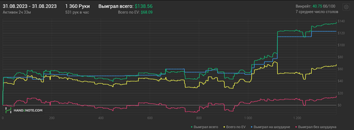 31/08/2023: 2.33ч, 1360 рук nl25 +$111.