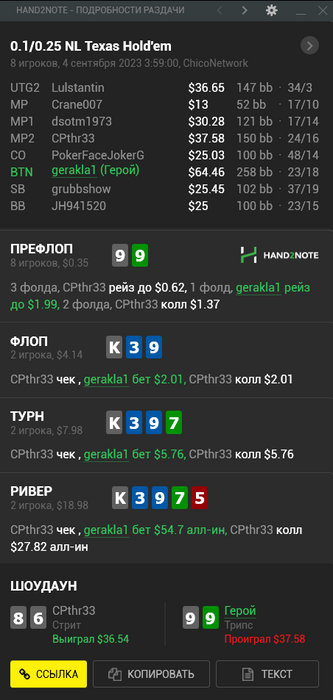 Неплохо поиграл, вначале понапихали в меня випы, кое-где я явно недофолдил оверпары и топпары, но под конец из -$210 по ев вывел в -$35, хоть так.