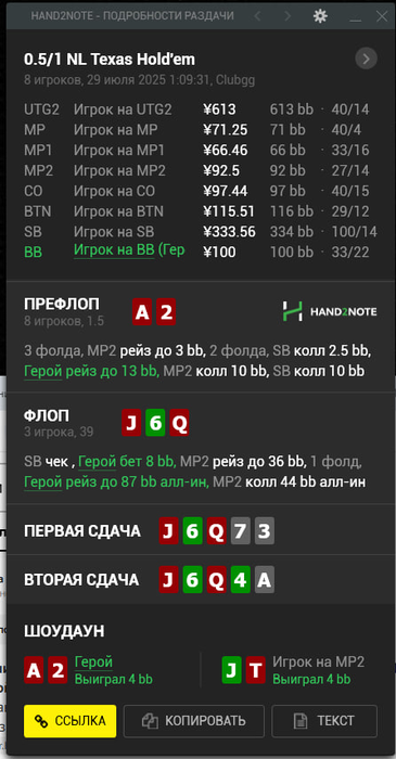 Кто в этой раздаче рег? Вроде 2 фиша, на сб точно, на мп2 какой то полупокер 27\14 с 90бб, который тупо тригернулся (переиграл, тильтанул).