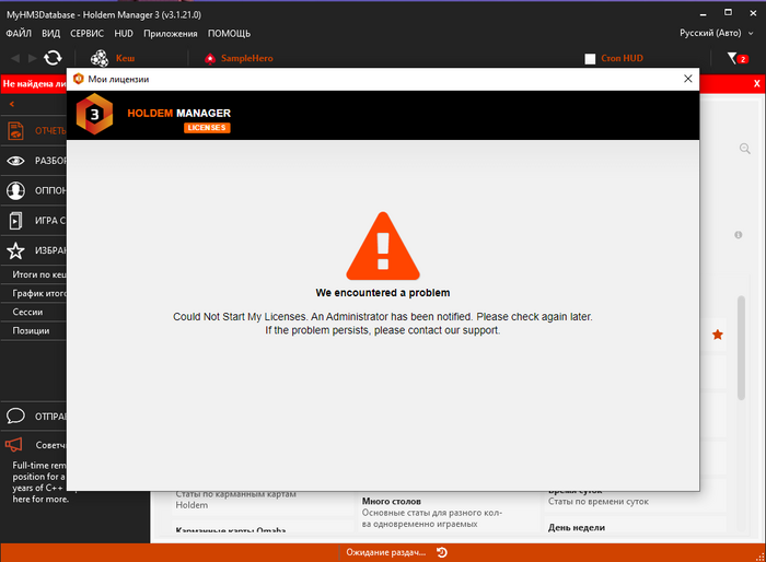 Boby, Нашел инсталлятор старой версии 3.1.21.0, установил и заработало. Но не активируется лицензия . Также я не могу авторизоваться на сайте holdemmanager (вчера еще мог), скорей всего из-за этого не авторизируется лицензия в софте. Как такое может быть?