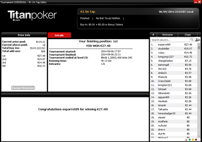 Зато есть первая победа на Titan Poker. Турнир On tap мне понравился, несмотря на 1500 стартовый стек, очень хорошая плавная структура, ну и радует, что они стартуют в режиме Sit and Go. Имхо, намного лучше кошмарных 180-max на PokerStars ("занял 10 место - повод для суицида").