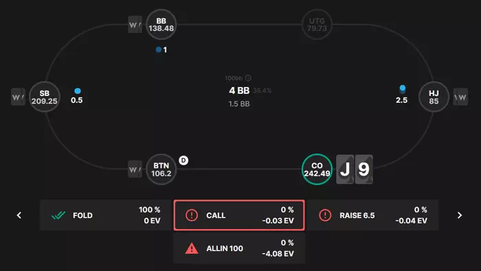 Но вот как выглядит даже 3х рейз против 33% цбета с GTO диапазонами BTN и HJ (разница между 3х и 4х невелика, если HJ тут играет с рейзом одного размера). Рейзим 10% рук: