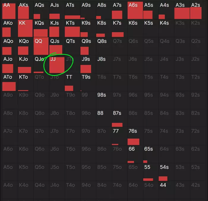 Видимо, KJ ему так нравится рейзить тоже из-за блокеров, потому что в диапазоне контбета BTN у JJ особое место – это единственная рука, где все комбы играются 100% бетом. Даже QQ немного отстает (из-за QQsc с блокерами на оба флешдро).