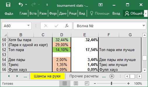 Чуть ниже вы увидите очень и очень лояльный по отношению к АйПокеру расчет, ибо я не смог сходу придумать, как оценить дисперсию выдачи топ-пар, двух пар, фул-хауза и флеша с флопа одновременно с совпадением просто "пары или лучше".