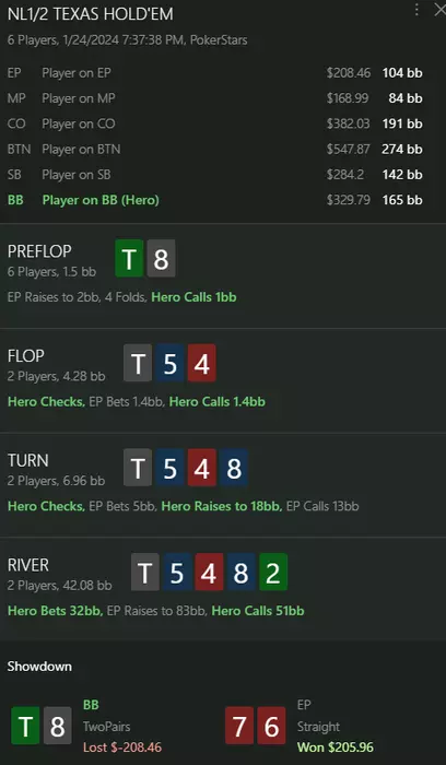 Ситуация затрудняется. Я обычно защищаю такую руку в основном только против любителей, поскольку против рега играть(еще и без позы) по ряду очевидных причин будет на порядок сложнее. Но раз уж зашел, то надо переигрывать:) И для этого нам кладут не самый худший флоп с попаданием в ТП. Далее BB 100% чек, поскольку очевидно что у утг преимущество диапазона и сбет 33% от утг. У нас неплохое попадание и его можно как рейзить так и колить, но по большей части скорее кол, ведь кикер слабоват и у оппа в диапазоне все оверпары. Далее выходим на терн и получаем усиление в виде второй пары, которое перемещает нашу руку ближе к топу диапазона, а в диапазоне оппонента по прежнему достаточно много велью которое он продолжит ставить, поэтому можно чекнуть с намерением сделать ЧР и так и происходит. Получив ЧР надо решить какого размера выбрать рейз и я был бы склонен поставить жирный рейз поскольку все оверпары и дрова очень часто готовы будут платить, так как у них еще и позиция в преимущество будет помимо прямого эквити. Размер бы выбрал такой чтобы максимально приблизить спр к 1 на ривере с планом сделать внедрение и поставить в максимально неприятную ситуацию большую часть его диапазона. Понятное дело что стритам и сетам мы отдаемся, это произойдет так и так, но их там мало, а то с чего мы можем добрать это оверпары и ТП которые будут составлять порядка 50% диапазона. И с которых необходимо добирать иначе в защите T8o нет никакого смысла.
