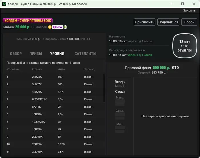 Супер саттелит будет в день турнира (18 октября, в 15-00 мск). Бай-ин (если без билета) 1500р, гарантия 3 места в главный турнир по 25000 рублей