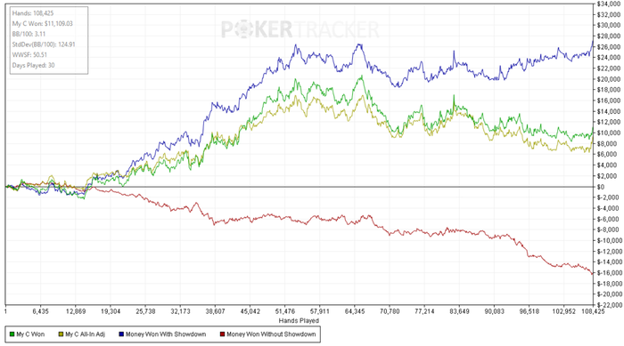 Из интересного - катал относительно много хедзапа. Спасибо товарищу Мангалу за то, что регулярно давал мне экшен на пятихатке. Как говорится, кто в курсе - тот в курсе. В одной из сессий мы с ним катали пять столов ХА одновременно. Надо отдать ему должное - парень определённо выносливый и упёртый. It takes one to know one.