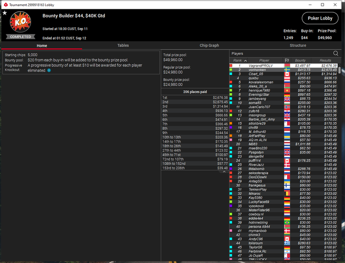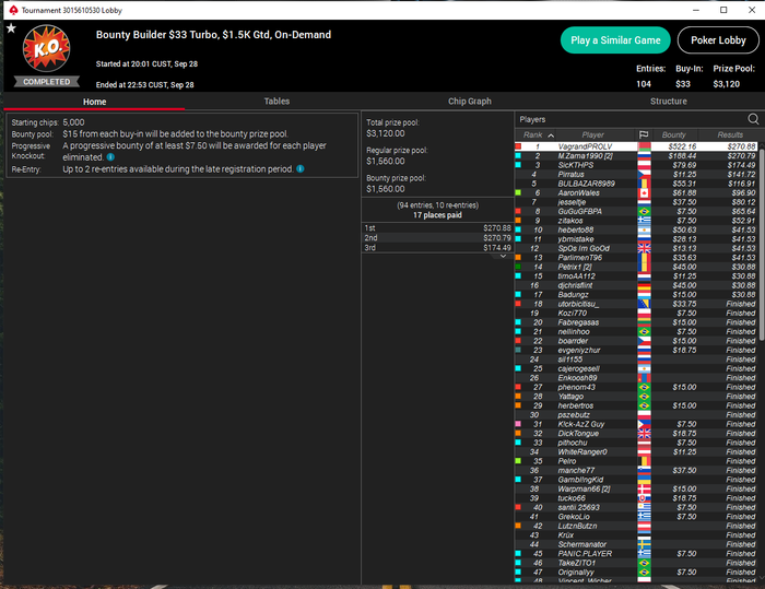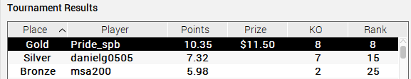Всем привет) Поздравляю победителя, призеров и баунти хантеров вчерашней хомки! По поводу баунти и билетов не волнуйтесь все будет начисленно и переведено в ближайшее время) Победил в турнире игрок под ником Ooshibok в ХА переиграв своего земляка antonio77755, баунти в турнире получили сразу 4 игрока id1oterne, Xatabuch13, ORV5Official по 10 у.е за выбивание специально приглашенных гостей и "невероятные" 50 баксов отправятся nodary77 за выбивание меня люимого ( 66 в АК для стримера без шансов) , так же первые 9 мест к своим кеш призам добавят по 1 билету на GG Masters Daily по 25 у.е и отдельно билет получит бабл бой турнира. Еще раз поздравляю, всем удачи)