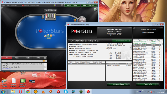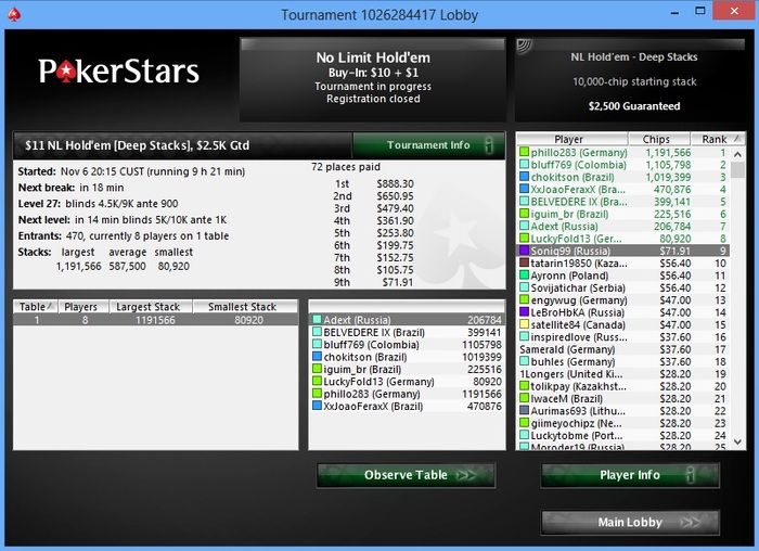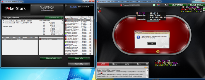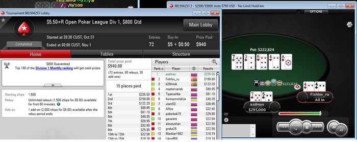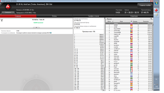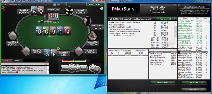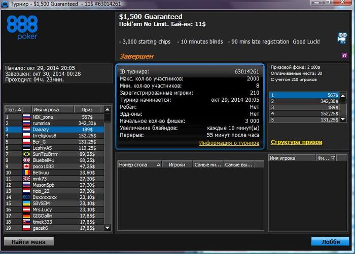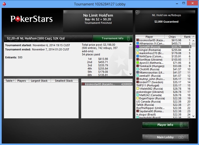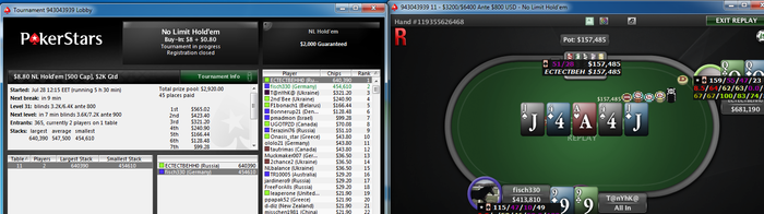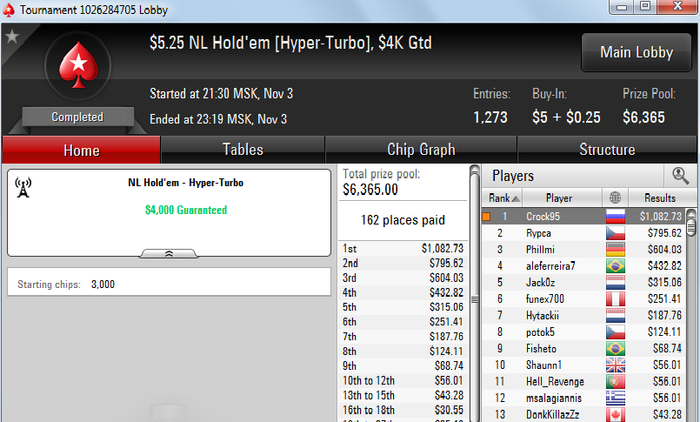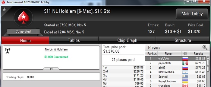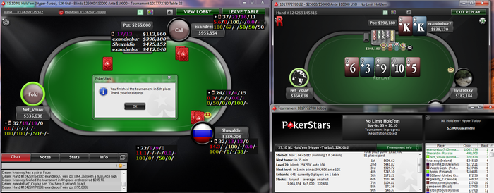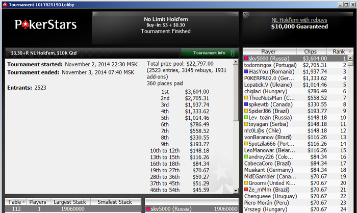 Втащил, несмотря на поднятия рейка в этом турнире в 3-max оставался с 1,5бб, но на мой пуш опп на большом блайнде нашел "фолд". Пришлось за это "покарать"