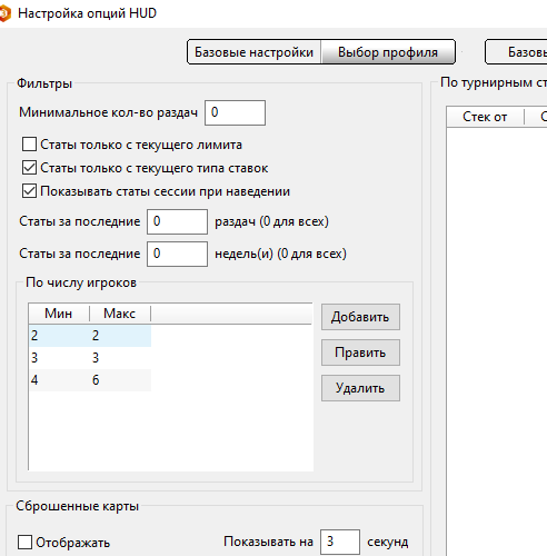Подскажите пожалуйста. У меня такая проблема: мне нужно что бы худ, в холдеме3, отображался только на PokerKing. Но я так же играю друугие румы с хендтуноутом и там мне не нужно что бы отображалась статистика холдемменеджера3. Я удалил все пути из Site setups, а так же в Hud Options выставил в фильтрах вместо Any в графе Site: Winning, но мне все равно выдает худ на старзах