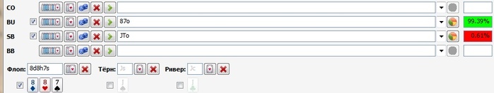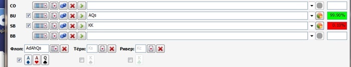 Подумал тут вот еще о чем. Я давненько не колировал пуши широким спектром. Мои колы пушей это узко QQ+. Это в корне неправильно. Во первых против КК Ах имеет больше эквити чем QQ, во вторых это очень эксплойтно...причем именно широко пушащими фишами..они пушат почти любой треш, а я отвечаю только узким спектром QQ+...так еще и переезжают периодически.
