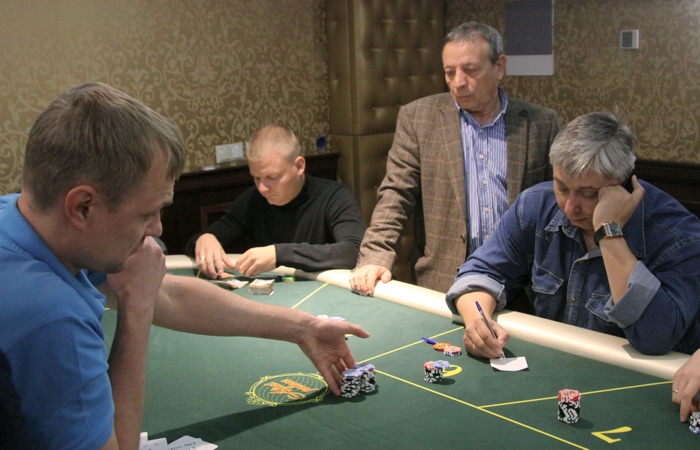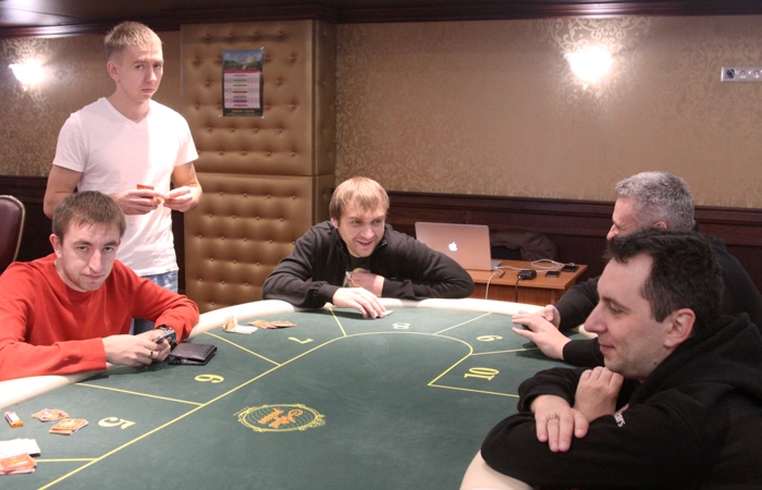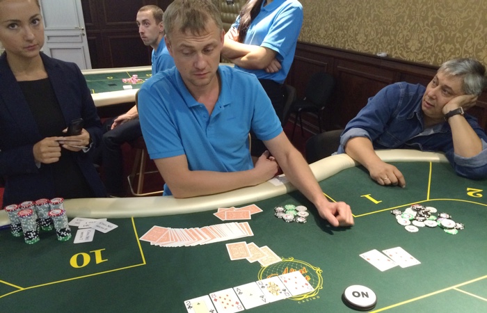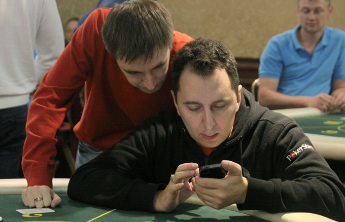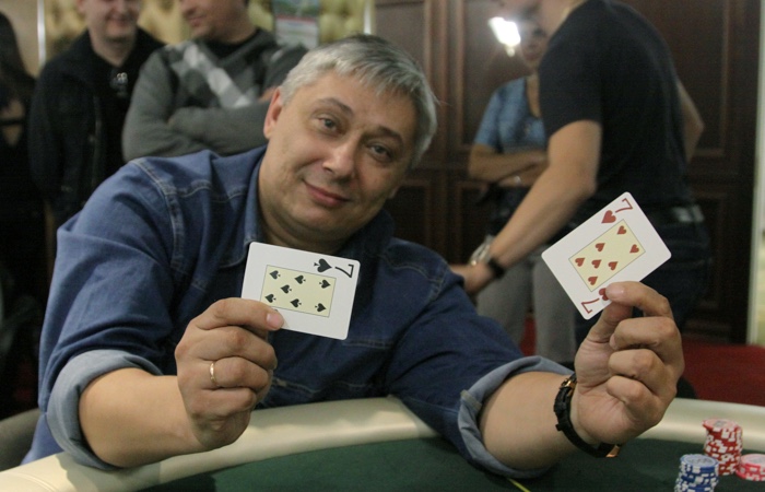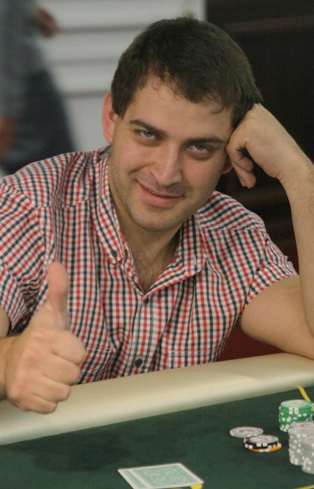 Немеренное количество входов совершил и Анатолий Дробышев, причем большая часть его фишек ушла в стек соседа слева. Тактика "олл-ин не глядя" для Евгения Попова - милое дело! "Работает схемка?" - спросил его, пробегая мимо их стола. - "Конечно! Вот, смотри..." - и он показал на приличную стопу фишек.